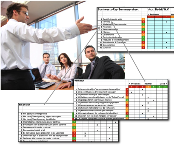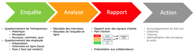 Pendant 3 à 5 jours de présence effective dans votre entreprise et au moyen d’interviews avec vous et les personnes-clés de votre organisation, nous collectons des éléments sur les différentes facettes à savoir les ventes, le marketing, la production, les achats, la gestion du personnel, etc ...